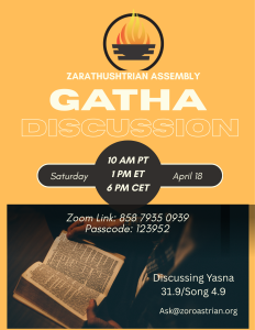 Join us for an informal study of the Gathas, the sacred songs of Zarathushtra. On this date, we will be exploring Yasna 31.9, Song 4.9.