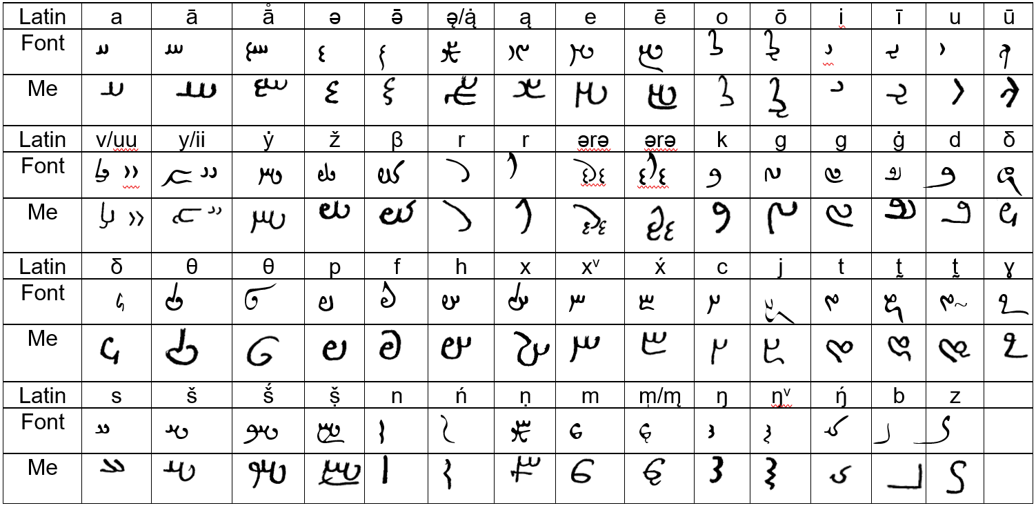 The following document contains multiple sections. The first is a list of all the letters with their Latin transliterations and possible IPA equivalents. In this chart is also a guide for the pronunciation. Given how Avestan is a dead language, and the accurate pronunciation of it seems to have disappeared from the Zoroastrian priesthood sometime in the last 400 years, this should be treated as probable suggestions rather than the certain pronunciation, especially for the vowels. Following this section, there is a section on the writing of the script, showing my own handwriting (rather than the computer font) and some guidelines for the proper writing of the letters and how they correspond to each other. Finally, the last section is reading, which contains a few example texts along with suggestions on where one can find larger resources for reading Avestan. The digital fonts that are used are the Avestan and Pahlavi fonts of the Ancient Iranian Font Project by Emily Blanchard West in collaboration with William Malandra.[3]